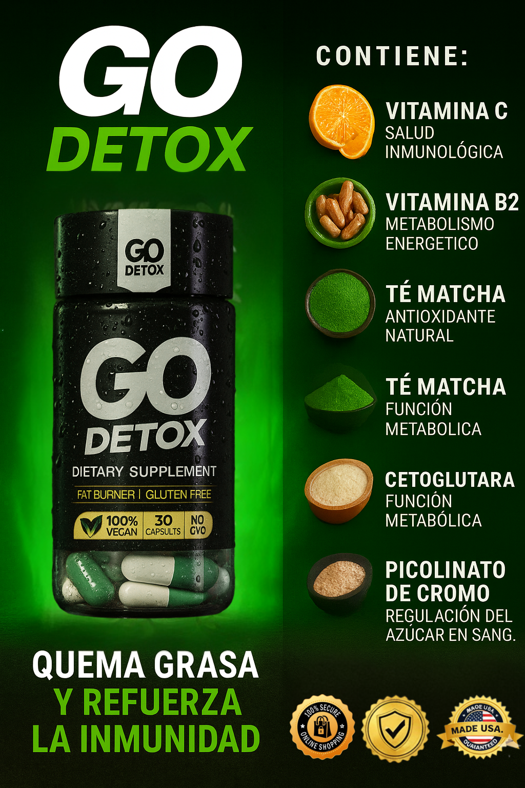Comprar Go Detox Doble Fórmula es elegir un suplemento premium que ofrece más que pérdida de peso: desintoxica, acelera tu metabolismo, fortalece tu sistema inmune y te brinda energía diaria. Con su fórmula única de 8 vitaminas y 10 ingredientes naturales, obtienes resultados visibles desde la primera semana de forma segura y sin sacrificios.
